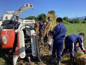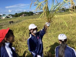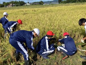 稲刈りにチャレンジ(5年生) 作成者 atagosyo公開日 2025年10月15日 9月30日(火)に5年生は稲刈り体験をしました。田植えを教えていただいた「愛宕っ子を育む会」の皆様と一緒に行いました。 「かまを強くひっぱったり、ひいたりするのが難しかった」「体力が必要であることが分かった」などの感想が多く、稲刈りの大変さを実感したようでした。また、「美味しいお米になるのが楽しみです」など,稲を育て,お米を収穫するという農業の楽しさも学ぶことができました。